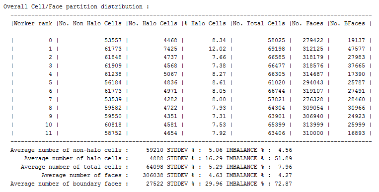 对于并行服务器,报告的结尾处包含一个网格单元/面分区总体分布表。示例如下所示: