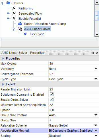 电化学表面反应故障排除 如果在运行表面反应模拟时残差不收敛,可以进行调整来改善求解并实现收敛。由于表面反应模拟中的边界条件为非线性条件,因此可以调整求解器设置,将非线性条件考虑在内:要调整求解器参数: 选择求解器 > 电势 > 亚松弛因子跃升 > AMG 线性求解器节点。 激活启用直接求解器。 将加速方法设为 Bi 稳定共轭梯度。