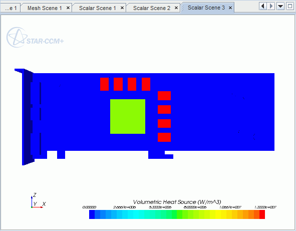 在这种情况下,显卡上的八个存储芯片具有相同的体积热源,而 GPU 芯片具有不同的值。 剩余的零部件没有体积热源。
