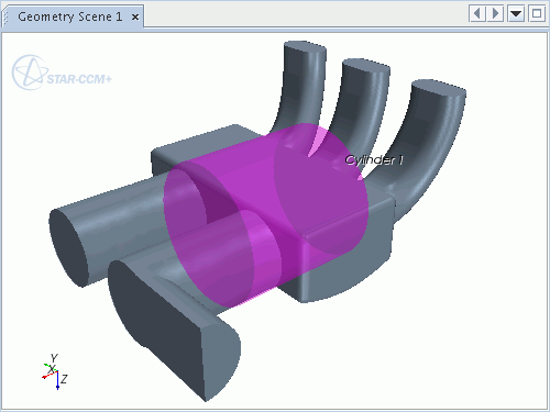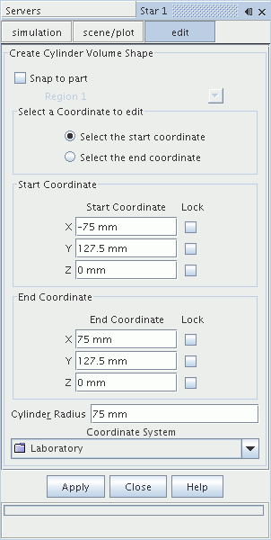 要定义圆柱体,根据全局笛卡尔坐标系或局部坐标系指定两个独立位置(开始坐标和结束坐标)和一个半径。 可以将坐标手动输入对话框中,也可使用点工具将起点和终点拖到适当位置。 可通过输入半径值并按 Enter 键查看圆柱体的表示。 按创建按钮可在体形状节点下创建名为 Cylinder 1(圆柱体 1) 的新节点。 可根据需要重复此过程任意次,以创建更多圆柱体形状。 按关闭按钮可完成该操作。