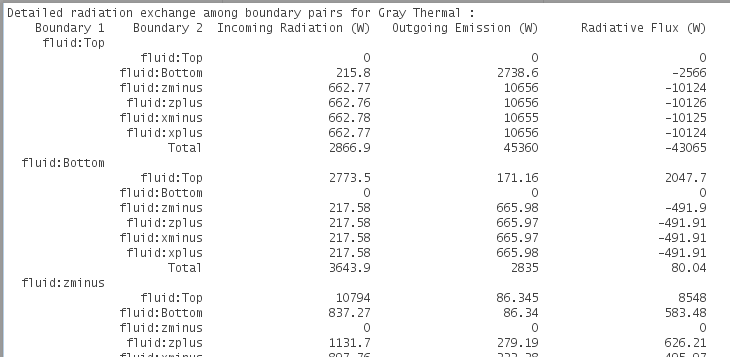 如果使用表面至表面模型,可通过右键单击 S2S 求解器节点,然后选择显示详细的辐射交换,生成边界之间的详细辐射交换总结。该总结显示在输出窗口中。