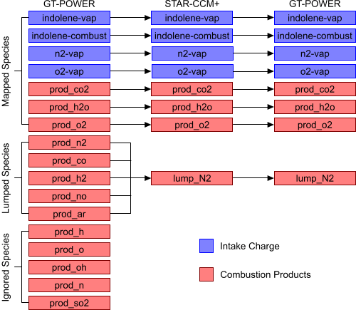 此 GT-SUITE 模型有四个组分来定义进入气缸的新鲜空气/燃油混合物(进气充填)。 除了这些组分之外,有 13 种燃烧产品。 因此,GT-SUITE 模拟中共有 17 种组分。 进气充填组分始终在 Simcenter STAR-CCM+ 中单独表示。 不过没有必要在 Simcenter STAR-CCM+ 中跟踪所有已燃组分,因为其中一些组分仅微量存在。 lump_N2 标量在 Simcenter STAR-CCM+ 中表示这些可以忽略的组分。