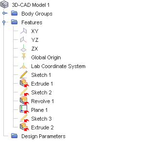 处于回滚状态时,可在特征树中插入新特征。这些新特征会正好位于回滚特征的上方,且在前滚至后仍将处于该位置。只能用活动特征构建 3D-CAD 模型。回滚特征上叠加有回滚符号