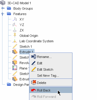 3D-CAD 特征树包含回滚特征时,可前滚至其中的某个特征。前滚至到特定的特征可重新激活该特征及其之前的所有特征。CAD 引擎会在 3D-CAD 模型构造中包含这些重新激活的特征。