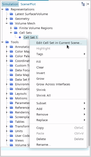 要在当前场景中编辑网格单元集,右键单击网格单元集节点,然后从弹出窗口中选择: