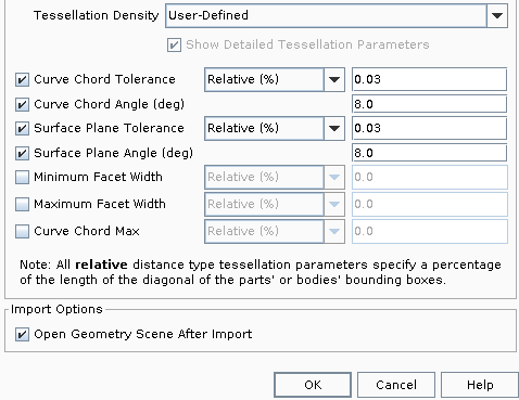 此选项影响导入模型中表面曲率的保留程度,即:精细选项将使用较多的三角形来离散弯曲表面,而粗糙选项则会使用较少的三角形。通常,建议从使用任一粗糙选项开始导入。导入之后,检查表面三角形化,并根据需要使用更高密度重新网格化几何。对于曲率较高的几何,如果需要更高的表面重构保真度,建议使用某个更精细的网格化选项。网格化密度选项不会影响平表面。无论使用何种设置,这些表面均会获得相同的三角形化。