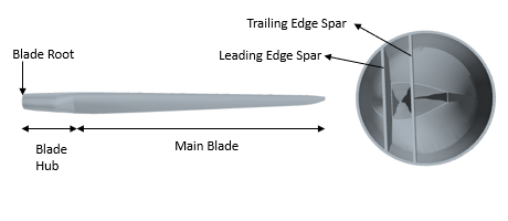 在本教程中,您将计算国家可再生能源实验室 5MW 风轮机叶片的正则模态和固有频率。叶片几何包含三个不同的截面:叶片轮毂、主叶片和内部翼梁结构: