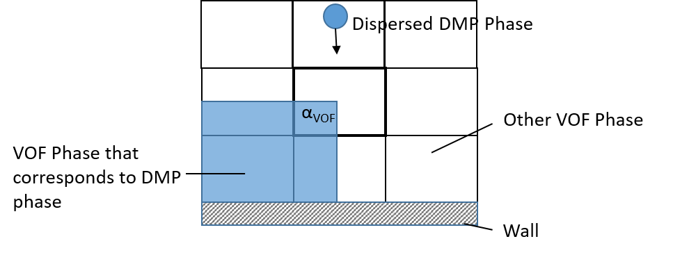 下图描绘了液滴(建模为 DMP 相)碰撞液体自由表面(建模为 VOF 相)或干燥壁面的情况。 DMP 碰撞相的质量仅传递到与 DMP 相具有相同材料的 VOF 相。 液滴接近自由表面时穿过的网格单元未由蓝色的 VOF 相完全填充,填充部分由体积分数 给出。