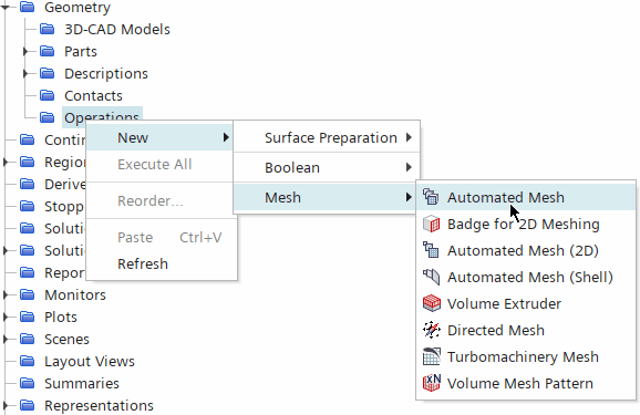 将几何零部件分配给区域后,可以继续使用网格操作来定义和生成体网格。网格操作在节点中定义。