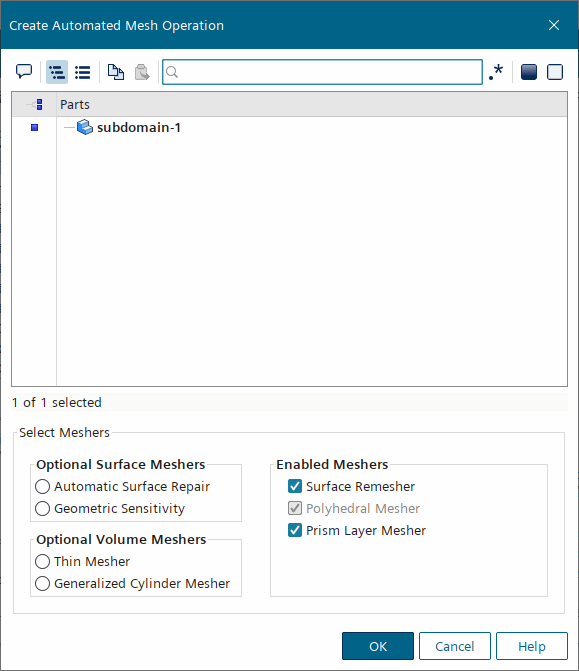 在自动网格操作中,为生成在计算域的壁面边界上创建的面网格、体网格和棱柱层选择不同的网格生成器。在此自动网格操作内选择的网格生成器适用于一个或多个所选的几何零部件。可以创建多个包含不同网格生成器和网格设置的自动网格操作。此处仅创建一个适用于一个几何零部件的自动网格操作。