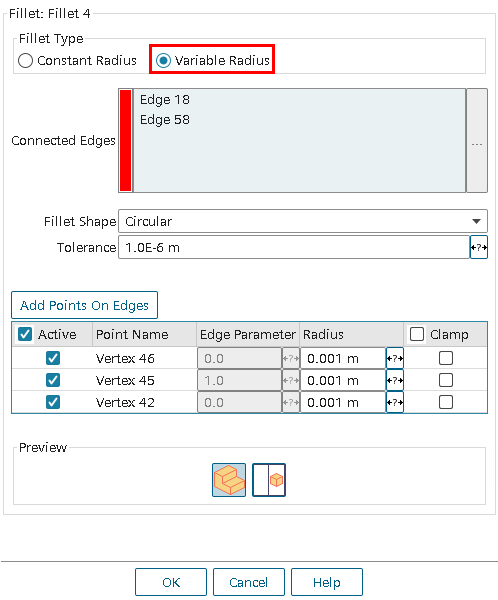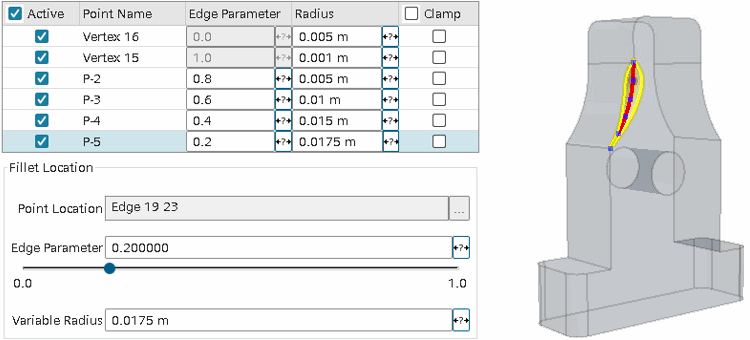 只要圆角穿过所选点,您就可以通过箝位在圆角上施加半径零变化率。箝位对起点、终点和中间点有效。