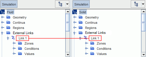 激活外部连续体模型时,Simcenter STAR-CCM+ 会将外部链接节点添加到模拟树,并创建一个链接节点 [链接 1]。链接表示与外部应用的连接。在此节点下可指定所有协同仿真设置。