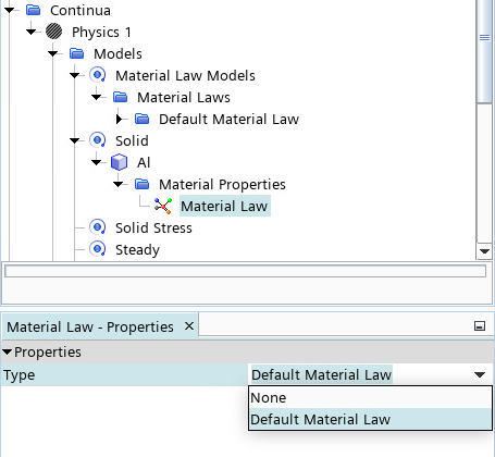 - 对于每个材料定律节点,选择定义材料行为的材料模型。可从以下某个节点访问材料定律模型: