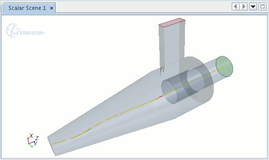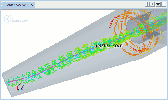 有关可用属性的详细信息,请参考涡流核心属性一节。可以在几何场景中显示涡流核心,或在流线显示器中显示为零部件。在流线显示器中,可以将其显示为线、带或管,并按标量对其进行颜色编码,如下所示。