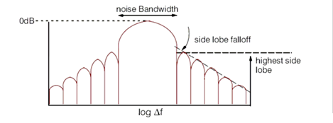 The windows vary in the amount of energy squeezed in to the central lobe as compared to that in the side lobes. The choice of window depends on both the aim of the analysis and the type of signal you are using. In general, the broader the noise bandwidth, the worse the frequency resolution, since it becomes more difficult to pick out adjacent frequencies with similar amplitudes. On the other hand, selectivity (i.e. the ability to pick out a small component next to a large one) is improved with side lobe falloff. It is typical that a window that scores well on bandwidth is weak on side lobe falloff and the choice is therefore a tradeoff between the two. A summary of these characteristics of the windows provided is given in table 1-1.