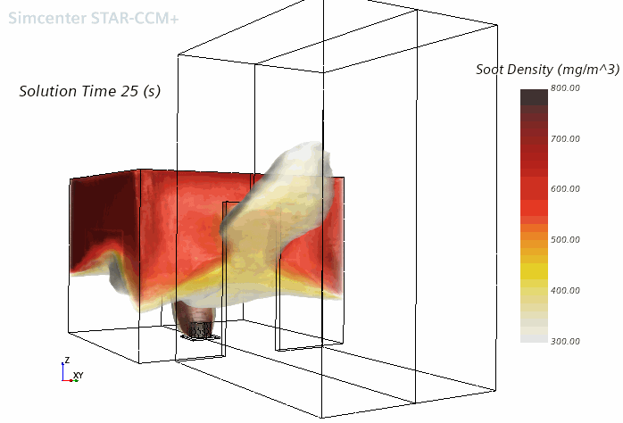 模拟运行结束后,标量场景显示完整的碳烟密度体积渲染。