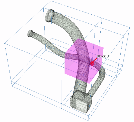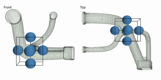 默认情况下,将包面设为自动确定体积范围的相关体积。在某些情况下,包面会告诉您一个或多个相关体积已失败。发生这种情况时,建议通过在体积范围内放置种子点来引导包面。要演示本教程中的过程,可为散热器软管体积范围添加种子点。在这里,由于包面是外部包面,所以在软管外表面和体积范围表面之间添加种子点。