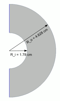一个半径为 1.78 cm,受到恒定温度 306.3 K 加热且具有无限长度的圆柱体置于另一个较大的半径为 4.628 cm 且以较低的固定温度 293.7 K 加热的圆柱体内。选择这些温度将在环带内提供一个总体温度 (Tb) 大约为 300 K 的均匀温度分布。因为预期流动将围绕中心线对称进行,所以仅需要使用一半几何,如下所示。