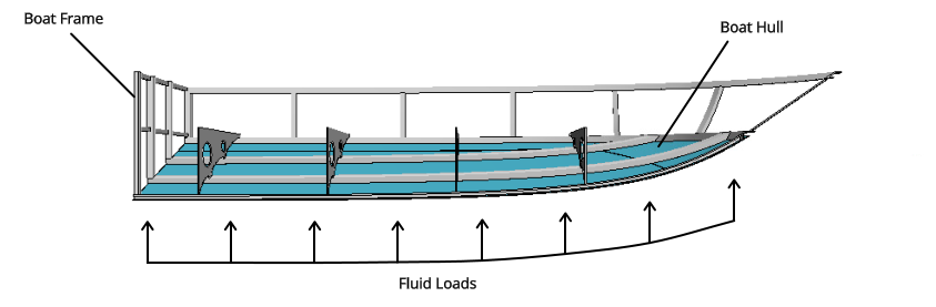 在固体应力模拟中,表示船体的固体区域沿船体和框架之间的交界面受约束。假设框架是刚性的,可以将船体和框架之间的交界面建模为固定交界面。当然,这会在固定交界面附近产生应力集中,其严重性取决于施加的压力。
