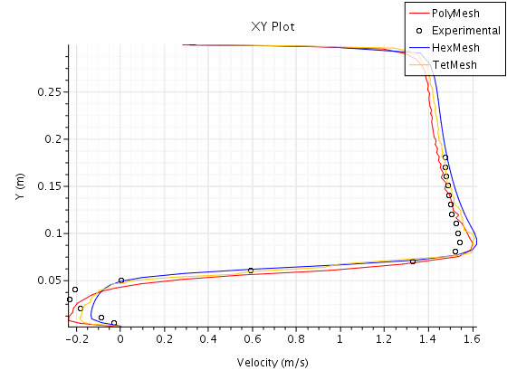 您已经检查了速度图,并看到数值求解与实验数据的对比非常好。 将在此网格上生成的速度数据与在六面体网格和四面体网格上生成的速度数据进行比较。