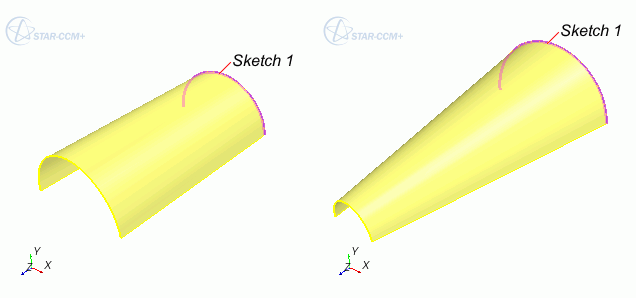 如果草图是闭合轮廓,则拉伸形成固体。如果草图是开放轮廓,则拉伸形成片体。开放轮廓不会形成剪切;它们仅形成新片体。在拉伸剪切中,通过投影闭合草图形成的固体将从其路径中的任何其他固体中减去。