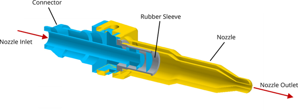 在本教程中,您将对可变形套筒与清洗喷嘴内的刚性组件之间的接触进行建模。几何由三个部件组成:连接器、橡胶套筒和喷嘴。