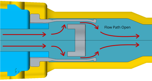 弹性橡胶套筒密封装配并充当阀。激活清洗系统后,泵将打开并对喷嘴中的流体加压。套筒因流体压力而变形。对套筒与连接器之间的接触以及套筒与喷嘴之间的接触进行建模。定义接触后,对橡胶套筒施加载荷,以模拟在泵被激活后的套筒变形。这会在套筒下方形成一条路径,允许流体流向喷嘴出口: