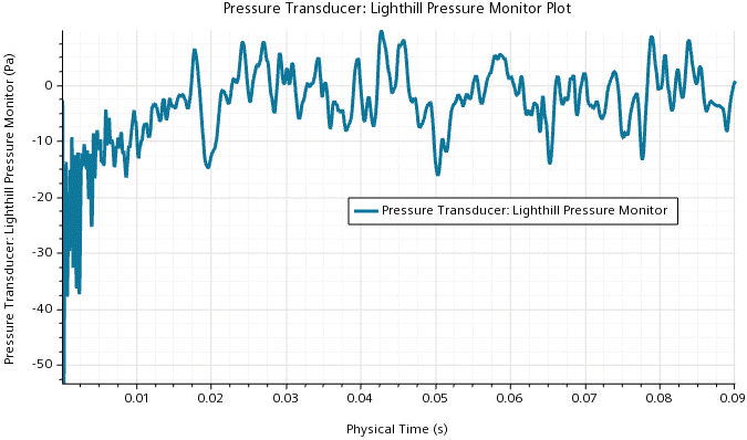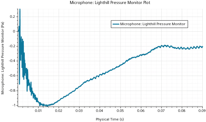 单击麦克风检查显示麦克风和压力传感器处的 Lighthill 压力的绘图:Lighthill 压力监视器绘图和压力传感器:图形窗口中的 Lighthill 压力监视器绘图选项卡。