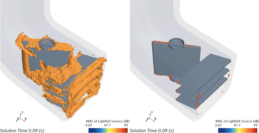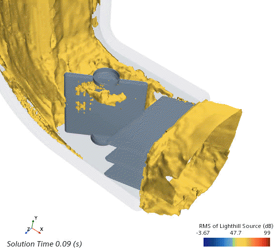 Lighthill 压力从 HVAC 管道辐射到测试室中。与 Lighthill 压力绘图类似,Lighthill 压力场在 HVAC 管道上波动较强,在与管道相距一定距离处波动减小。在这些速度几乎为零的静态流区域中,可以看到在整个测试室内传播的声波。