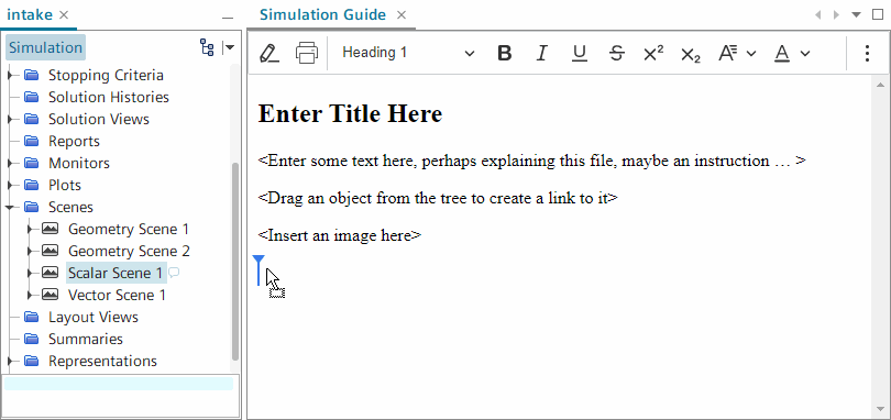 The simulation guide is a single embedded document that you can edit within a simulation file. This document can contain formatted text, tables, images, and hyperlinks to nodes in the Simcenter STAR-CCM+ object tree or external web resources.