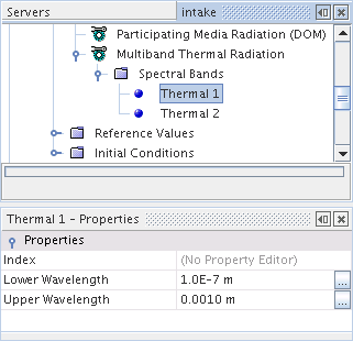 当激活多波段热辐射时,将使用光谱波段描述辐射光谱的离散化。光谱分为多个离散的波段,每个波段由波长下限和上限定义。每个波段的表面和介质属性可能不同。必须选择波段数和范围来表示辐射属性相对于波长的变化。但是,如前所述,辐射求解时间随波段数线性增加,因此通常需要在精度和运行时之间进行权衡。
