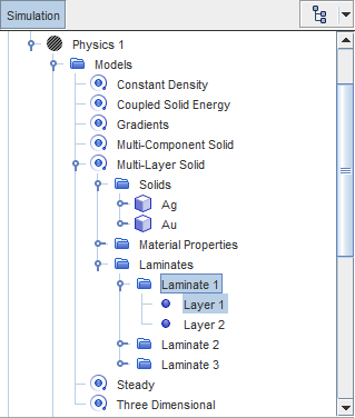 The Laminates manager node has a Laminate sub-node for each laminate in the simulation. In turn, each Laminate sub-node has a Layer sub-node for each layer in the laminate. Right-click on the Laminates manager to create new Laminate nodes; right-click on a Laminate node to create new Layer nodes. Rename Laminate and Layer nodes to suit the simulation.