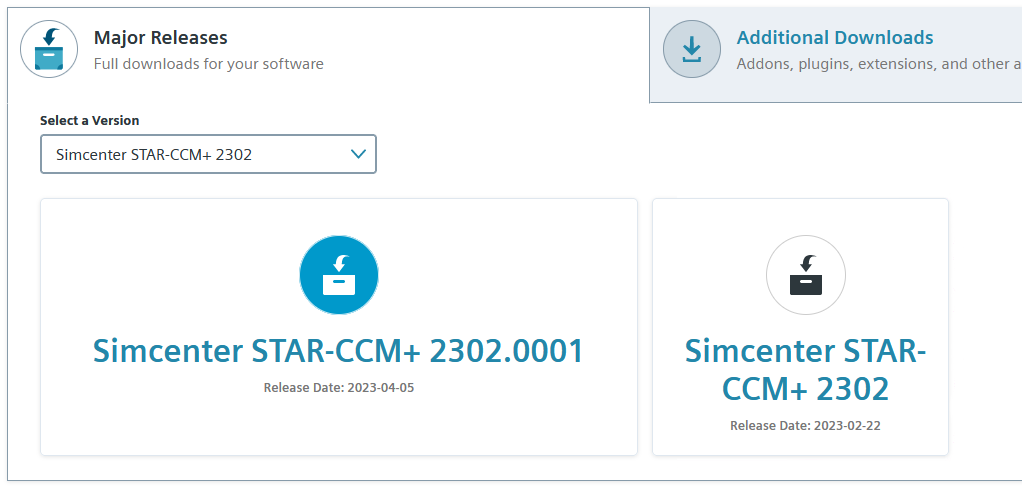 - On the Downloads page of Support Center, in the Major Releases panel, select Simcenter STAR-CCM+ 2406 from the Select a Version dropdown menu.