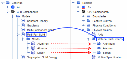 当将包含多部件固体模型的物理连续体应用于区域时,将材料部件组节点添加到该区域的物理值管理器。使用材料部件组节点在固体材料和几何零部件之间映射。