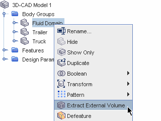 - 右键单击体管理器节点下的流体域体,并选择抽取外部体积。
