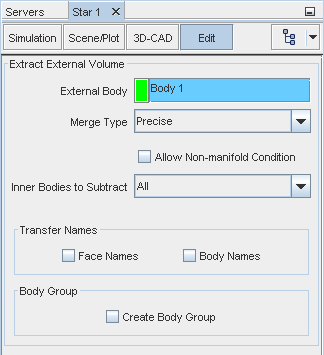 注 要修改外部体选择,可以单击外部体字段内部,然后从 3D-CAD 视图场景或 3D-CAD 特征树的体节点中选择所需的体。 - 如果要为生成的体创建一个体组,激活创建体组选项。