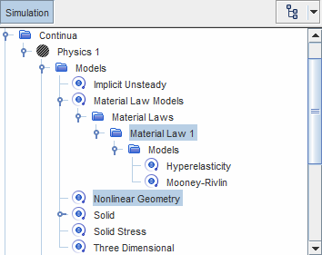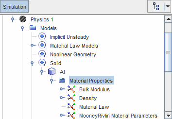 - Define the material properties manually by setting appropriate values on the relevant material property nodes. The properties available for each hyperelastic models are listed in the section Material Law Models Reference: Material Properties.
