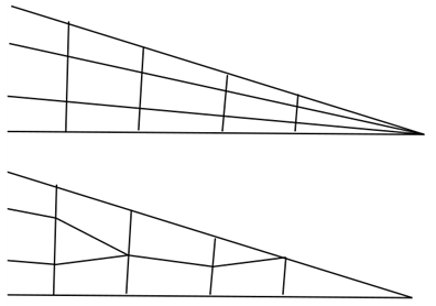 用于指定两条各向异性部件曲线之间薄体区域中的层大小。当具有两条在尖端处相交的相对部件曲线时,此选项非常有用。它用于在逼近尖端时使用小于最小层数的层数。 以下示例展示了如何在两条部件曲线之间的薄体区域中生成高质量网格。第一个示例(顶部图像)显示了已对齐网格,其中层在逐渐逼近后缘时变薄。对于本例,最小层数设为 3,薄体区域的狭窄区域中的最小层大小设为接近零的较小值。第二个示例(底部图像)显示了低质量网格,其中层在逐渐逼近后缘时减少。在此示例中,最小层数设为 3,不指定薄体区域的狭窄区域中的最小层大小值。