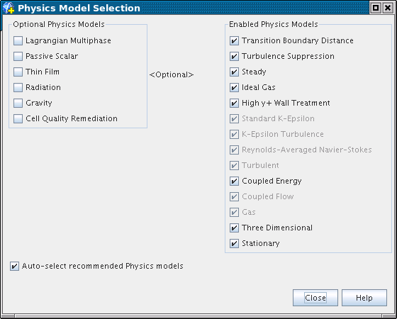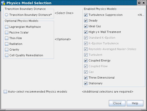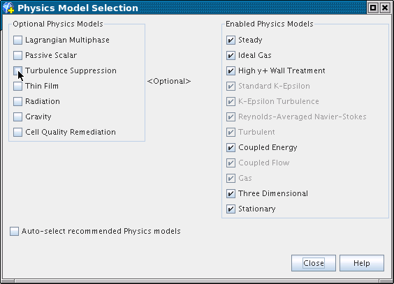 本节介绍如何在不使用“自动选择推荐模型”的情况下选择湍流抑制模型。 这意味着不会自动选择转换边界距离模型。