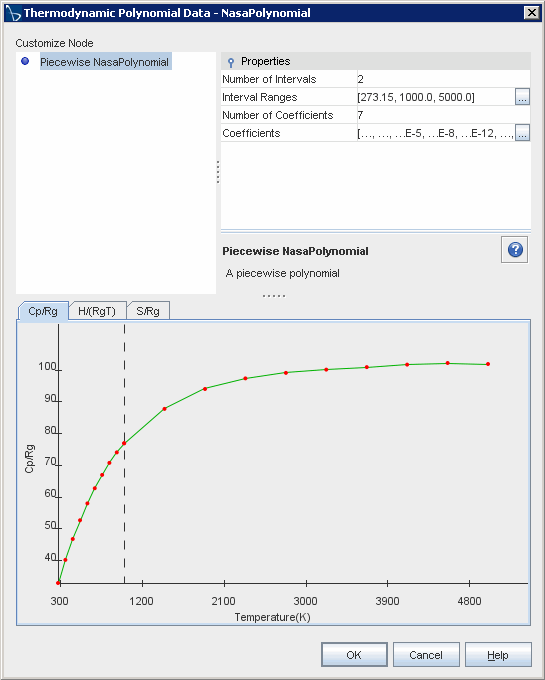 热力学多项式数据提供七个(或九个)系数 — 比热 的五个(或七个)系数多项式曲线拟合、静焓 的一个系数多项式曲线拟合,以及熵 的一个系数多项式曲线拟合。