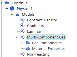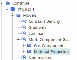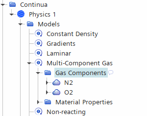 多组分混合物节点是两个管理器节点的占位符:一个节点表示可添加物质的混合物的组分,另一个节点表示混合物的属性。例如,在以下屏幕截图中,气体混合物节点包含气体组分节点和材料属性节点。