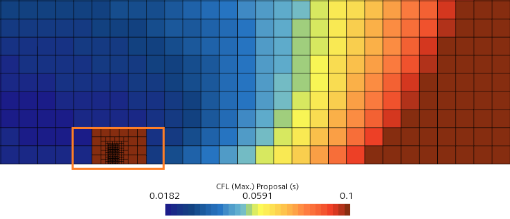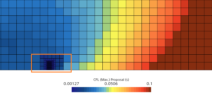 下图显示过滤前后模拟的 CFL (Max.) 建议分布。在将小网格单元(下面高亮显示的)排除在时间步建议计算之外后,建议的最小时间步将增大一个数量级。