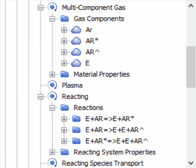 导入机制后,将使用等离子体组分(离子和中性组分)填充多组分气体节点。节点包含等离子体反应。例如,对于氩气等离子体反应: