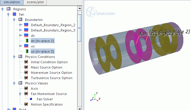 以下示例显示了风扇区域的上游和下移边界。 这些边界必须属于风扇区域连接流体区域的交界面。