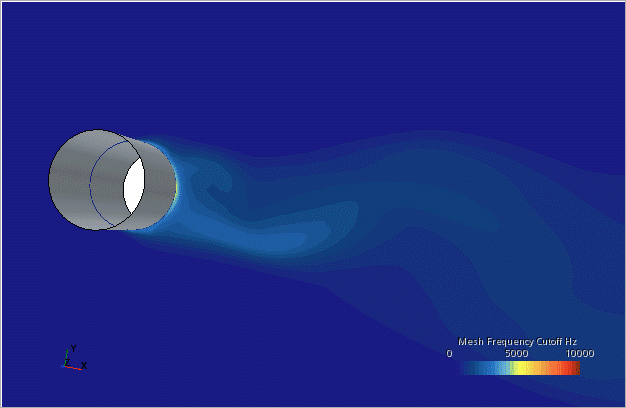 将预测频谱与稳态模拟的网格截止频率绘图相比较。您可以看到,稳态估测截止频率与 DES 计算高端频率分辨率具有密切相关性。所有频谱大约在 6000 Hz 处显示梯度变化。梯度变化表示较高频率能量梯度的变化,这是人为湍流结构分辨率不足的结果。这些梯度扭曲对应这些点本地的精细网格稳态网格频率截止值。500 Hz 左右的频谱峰值是预测的涡流脱落频率。