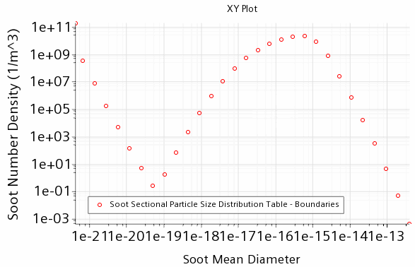 在求解运行时,绘图会自动更新以显示选定区域或边界上的碳烟截面颗粒尺寸分布。