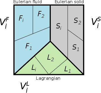 在下图中,网格单元体积 V 的体积分区可以由流体体积 V F 、多孔固体体积 V S 和离散相体积(此处为拉格朗日颗粒)体积 V L 之和组成,每个体积都可以由下标 i 所指示的各个相组成: