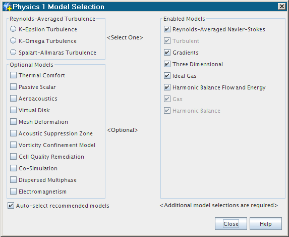 如果已激活自动选择推荐模型复选框,则模型选择对话框(以下屏幕截图中的物理 1 模型选择)中将提供三种类型的湍流:K-Epsilon、K-Omega 和 Spalart-Allmaras。