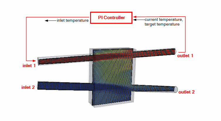 协同仿真过程中,Simcenter STAR-CCM+ 在监视选定出口处的温度时计算热求解。FMU 模型计算作为目标温度及 Simcenter STAR-CCM+ 中的当前出口温度的函数的最佳入口温度。Simcenter STAR-CCM+ 根据 FMU 计算的最佳温度更新入口温度。该循环将一直继续,直到出口温度收敛到目标温度。