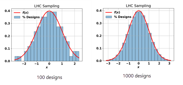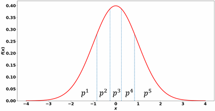 对于 m 个运行设计(样本大小),拉丁超立方体采样将分布函数 划分为面积相等的 段,并为每段选取一个值。下面显示了一个具有正态分布的输入参数和 5 个运行设计的示例: